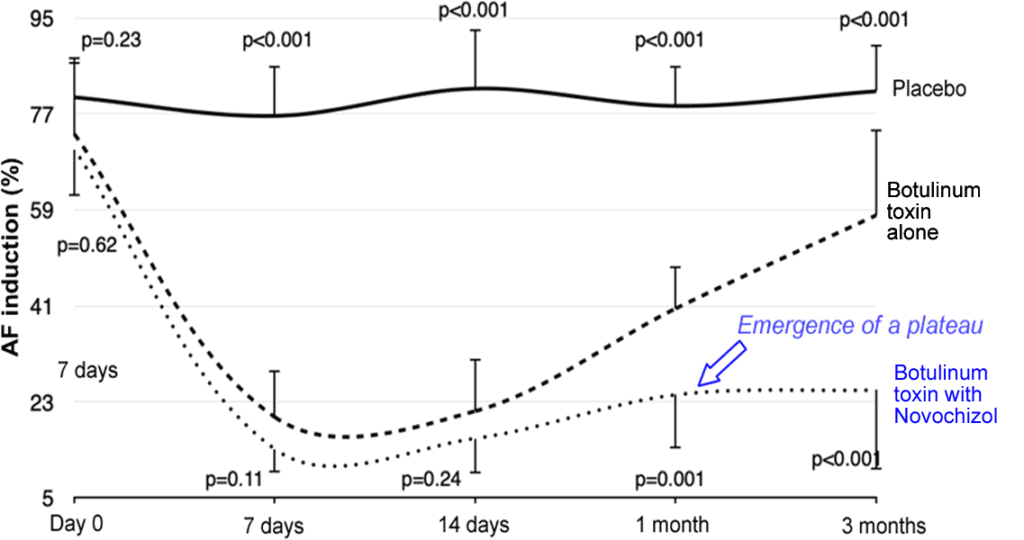 – Injections of NovochizolTM-botulinum toxin formulations into canine epicardial fat pads resulted in extended complete abolition of cardiac vagal responses and increased suppression of atrial fibrillation (Ref).